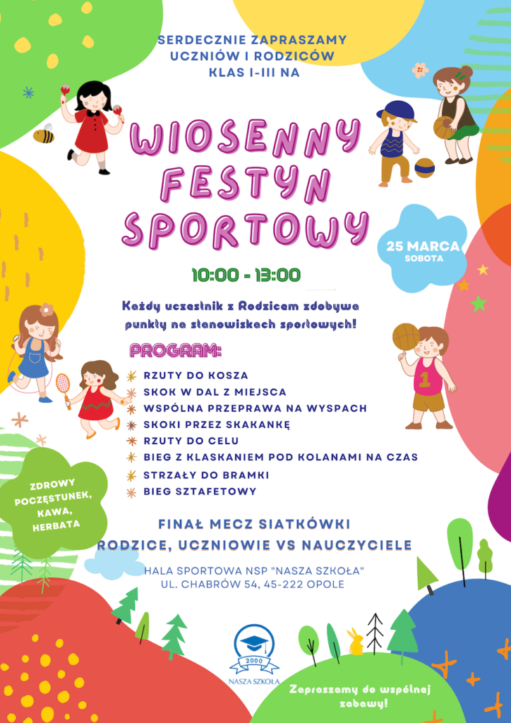 Serdecznie zapraszamy Uczniów i Rodziców klas I-III na WIOSENNY FESTYN SPORTOWY.